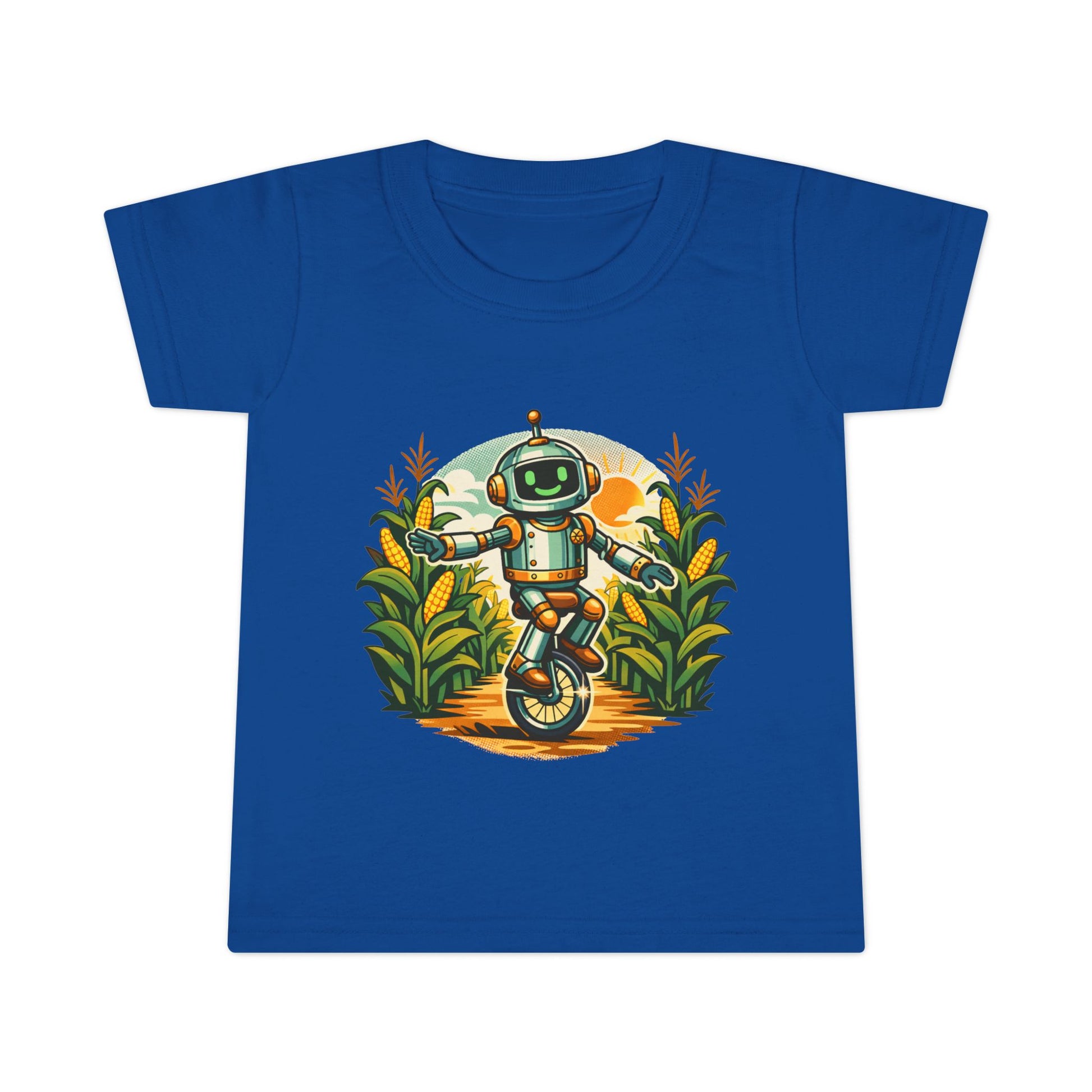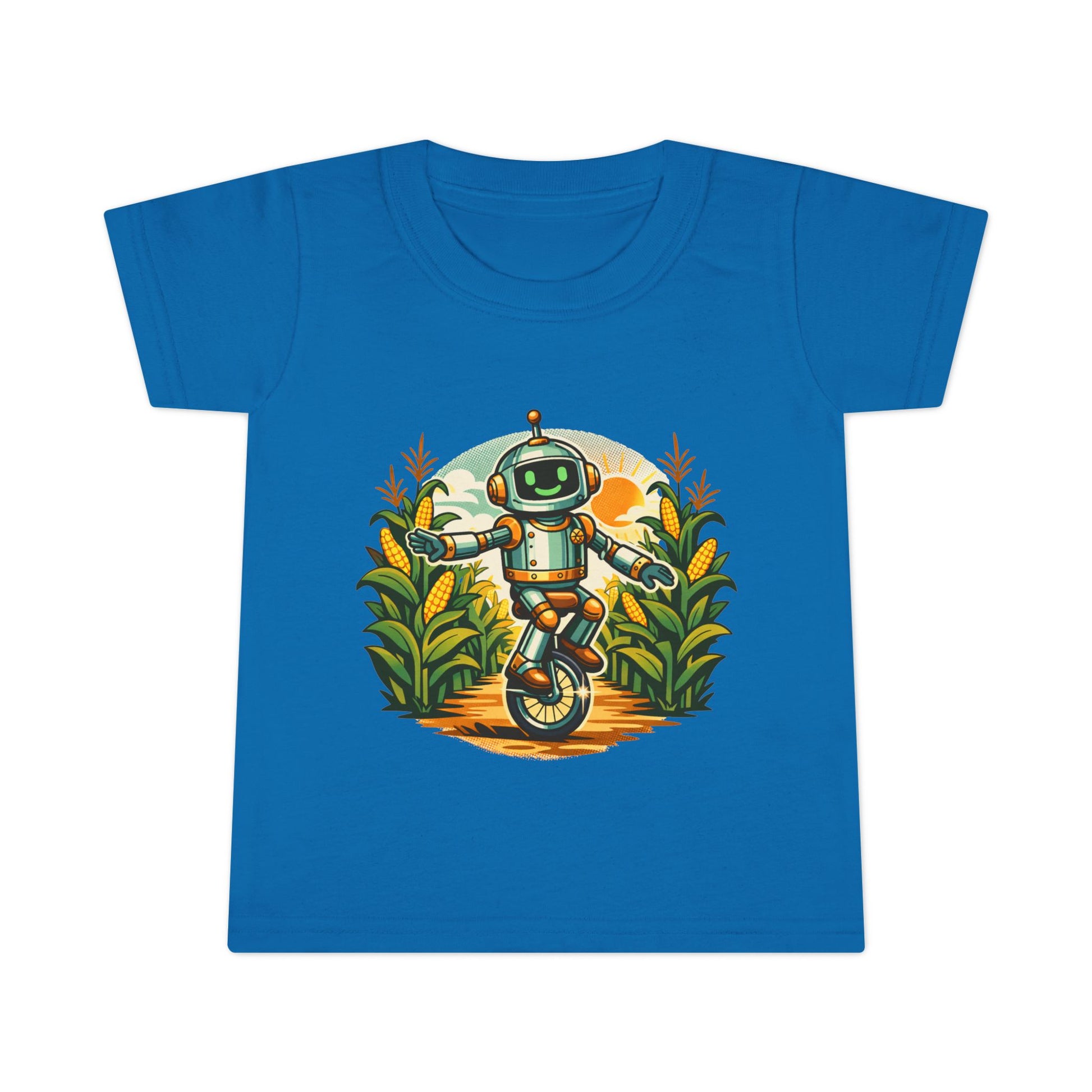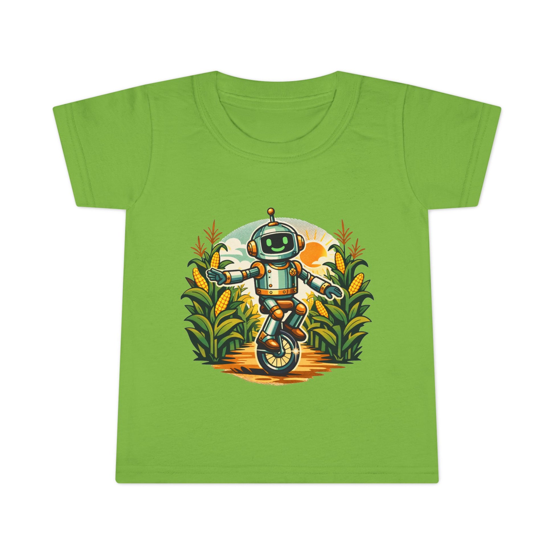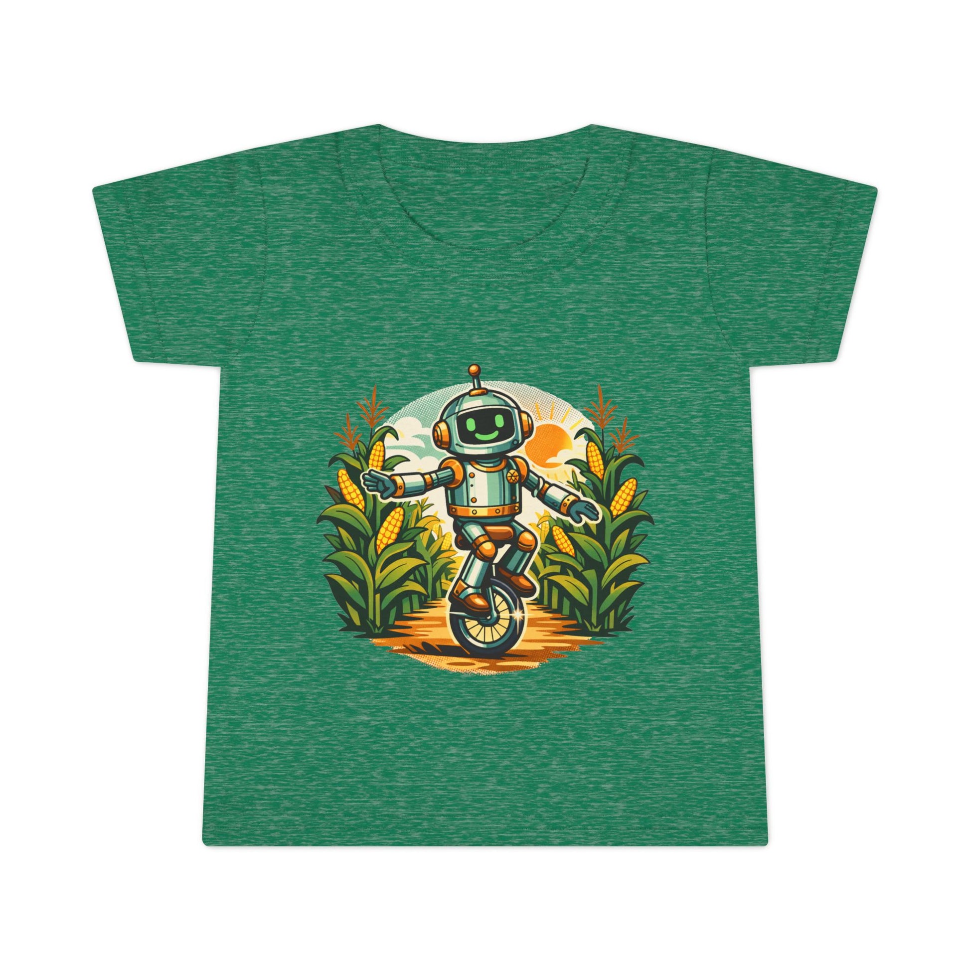 Tiny explorer meets backyard wonder. This toddler tee puts a cheerful unicycling robot at the center of a sunlit field, surrounded by tall, friendly plants and warm golden tones. The scene feels like a sun-after-rain afternoon: playful, slightly adventurous, and full of small discoveries. It slips into a little one's wardrobe easily — for sandbox expeditions, storytime under a window, or that slow stroll through the farmer's market. The soft, light fabric moves with them, and the stitched details mean it holds up to endless play and washes. Bright, optimistic artwork that sparks curiosity and invites conversation without shouting for attention.